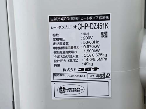 東白川村 コロナ自然冷媒CO2家庭用ヒートポンプ給湯機 ヒートポンプユニットCHP-DZ451K エコキュート交換工事