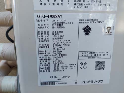 施工事例:美濃加茂市 ノーリツ石油給湯機付ふろがまOTQ-4706SAY 給湯器交換工事